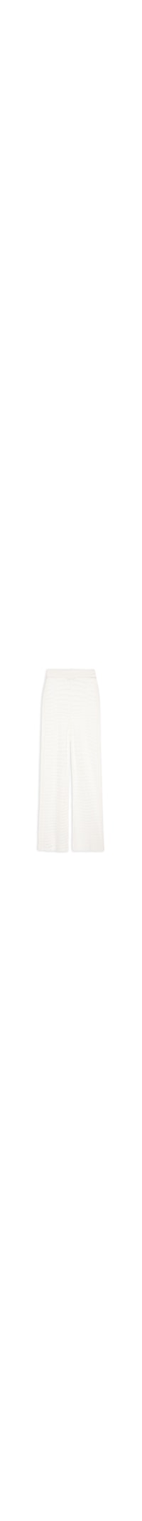 A calça branca é confeccionada em tricot com baixa elasticidade. A peça solta ao corpo possui cintura alta, cós elástico embutido, detalhes vazados na trama, transparência e comprimento longo.