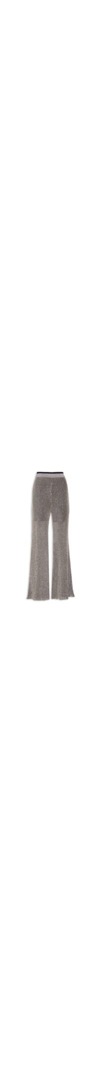 A calça prata é confeccionada em tricot canelado com fios de lurex e alta elasticidade. A peça justa no quadril e solta no corpo de modelo flare* possui cintura alta, cós com elástico embutido, padronagem de listras em cor contrastante, meio forro, transparência e comprimento longo.