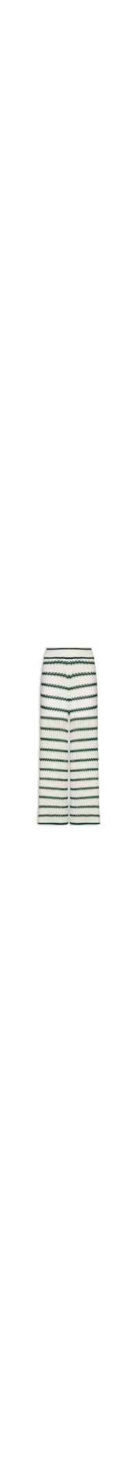 A calça verde é confeccionada em tricot de alta elasticidade. A peça solta ao corpo possui cintura alta, cós com elástico embutido, padronagem listrada em cor contrastante, trama com recortes vazados, forro em short curto e comprimento longo.