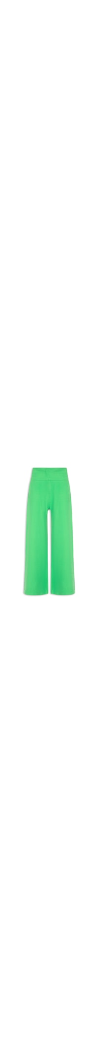 A calça verde é confeccionada em malha. A peça possui cintura alta, cós anatômico com elástico embutido, tag da marca aplicada na parte posterior, shape solto, caimento reto e acabamento pespontado.