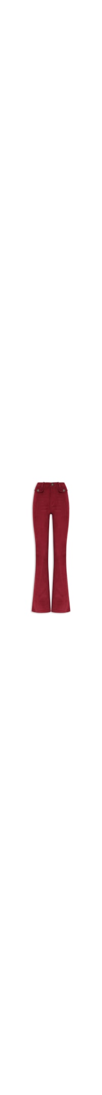 A calça vermelha é confeccionada em tecido leve com toque aveludado e baixa elasticidade. A peça de modelo flare* possui cintura alta, cós com passantes aplicados, bolsos frontais decorativos com aba e botão metálico, recortes frontais, comprimento longo e fechamento frontal por zíper e botão.
