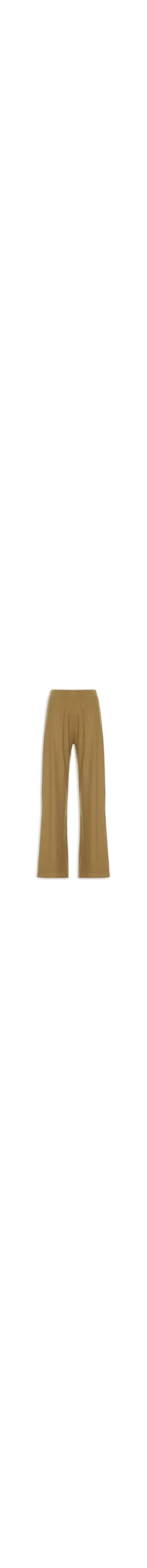 A calça marrom é confeccionada em malha canelada com alta elasticidade. A peça solta ao corpo possui cós com elástico embutido, cintura alta e comprimento longo.