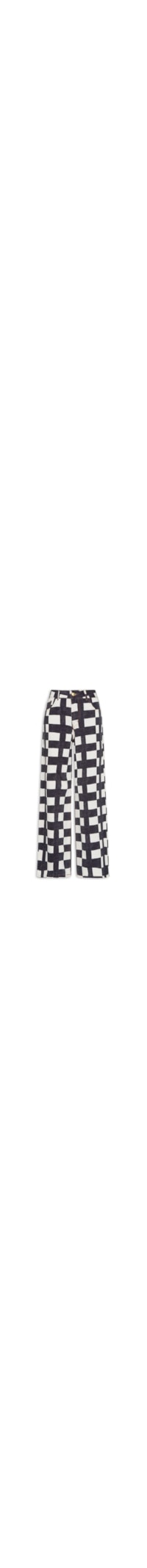 A calça preta é confeccionada em sarja sem elasticidade. A peça solta ao corpo de modelo wide leg* possui cintura alta, passantes aplicados na parte superior, five pockets** com rebites aplicados, recorte posterior, acabamento pespontado nos bolsos posteriores em cor contrastante, recorte posterior, tag com nome da marca aplicada na parte posterior, padronagem quadriculada em cor contrastante, comprimento longo e fechamento frontal em zíper e botão.