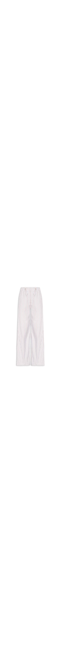 A calça azul é confeccionada em malha de algodão sem elasticidade. A peça solta ao corpo possui cintura alta, cós com elástico regulável embutido para ajuste frontal, bolsos frontais modelo faca, bolsos posteriores embutidos, padronagem listrada em cores contrastantes e comprimento longo.
