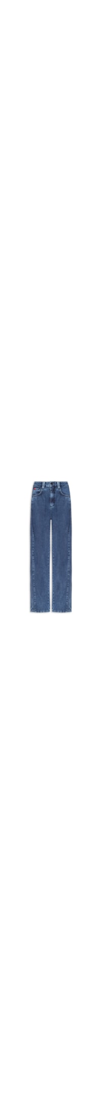 A calça azul é confeccionada em sarja com lavagem jeans algodão sem elasticidade. A peça de modelo barrel possui cintura alta, cós com passantes aplicados, five pockets*, recortes laterais com detalhe de três listras pespontadas, recortes posteriores, tag da marca aplicada no cós posterior, detalhe de listras aplicadas em um dos bolsos posteriores, comprimento longo, barra com acabamento pespontado e fechamento frontal por zíper e botão.