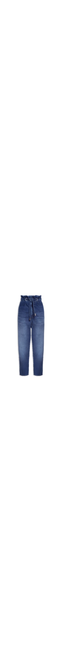 A calça azul é confeccionada em sarja com lavagem jeans. A peça possui cintura alta, cós com cordão embutido para ajuste com ponteiras metálicas, dois bolsos posteriores, tag da marca aplicada na parte posterior em metal, dois bolsos frontais embutidos, shape solto, caimento reto, comprimento cropped, acabamento pespontado e fechamento frontal por zíper.