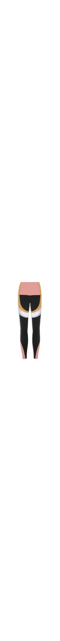 A calça preta é confeccionada em malha. A peça de modelo legging possui cintura alta, cós anatômico, recortes em cores contrastantes, recorte em tule, bolso posterior, bolso lateral, logo da marca aplicado na parte posterior, shape justo, caimento reto e acabamento pespontado.