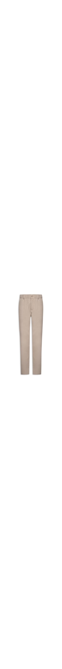 A calça bege é confeccionada em sarja sem elasticidade. A peça solta ao corpo possui cintura média, cós com passantes aplicados, bolsos frontais modelo faca e bolsos posteriores com fecho por botão e fechamento frontal por zíper e botão.