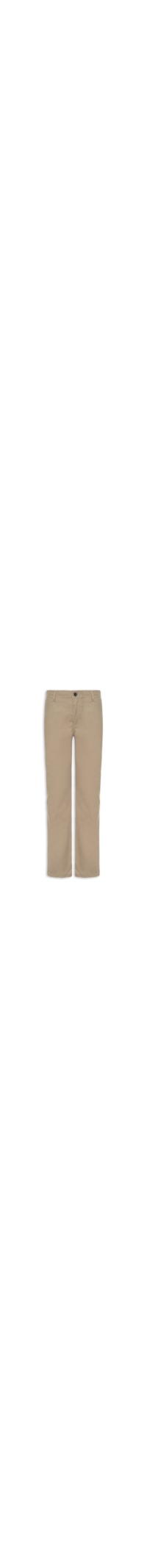 A calça bege é confeccionada em sarja com baixa elasticidade. A peça solta ao corpo possui cintura alta, cós com passantes aplicados, bolsos frontais modelo faca, bolsos posteriores embutidos com fechamento por botão, pences posteriores, logo da marca bordado no bolso posterior, comprimento longo e fechamento frontal por botão e zíper.
