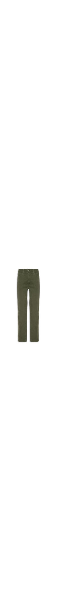 A calça verde é confeccionada em sarja de baixa elasticidade. A peça sola ao corpo, possui cintura média, cós com passantes aplicados, five pockets* com rebites aplicados, tag de couro da marca aplicada na parte posterior do cós em cor contrastante, recortes posteriores, comprimento longo e fechamento frontal por zíper e botão.