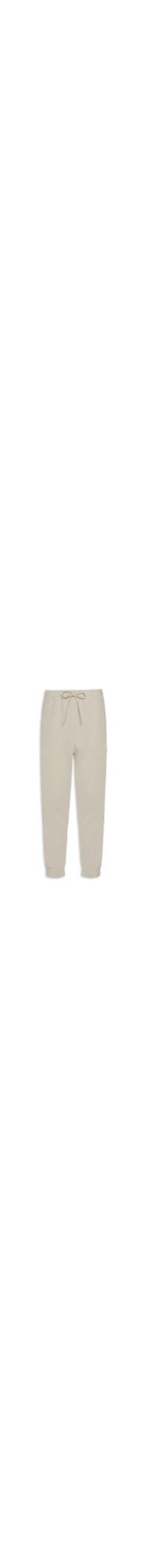 A calça bege é confeccionada em moletom de média elasticidade. A peça solta ao corpo, possui cintura média, cós com elástico e cordão embutido para amarração frontal, bolsos frontais embutidos com fechamento por zíper, logo da marca aplicado na parte frontal em relevo, bolso posterior embutido, barra afunilada e comprimento longo.