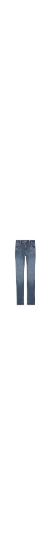 A calça azul é confeccionada em sarja com lavagem jeans de baixa elasticidade. A peça justa ao corpo, de modelo skinny*, possui cintura média, cós com passantes aplicados, five pockets** com rebites aplicados e detalhes puídos, tag da marca aplicada no bolso frontal e parte posterior do cós, detalhes puídos frontais, efeito estonado, comprimento longo e fechamento frontal por zíper e botão.