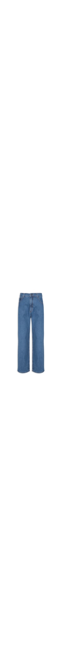 A calça azul é confeccionada em sarja com lavagem jeans sem elasticidade. A peça solta ao corpo possui cintura média, cós com passantes e tag da marca aplicada na parte posterior, five pockets* com tag da marca e rebites metalizados, comprimento longo e fechamento frontal em zíper e botão.