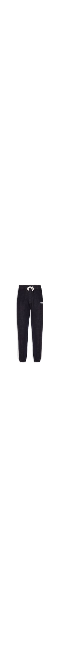 A calça azul é confeccionada em sarja com lavagem jeans. A peça possui cintura média, cós com elástico e cordão embutidos para ajuste, bolsos frontais de modelo faca, bolso posterior com fechamento por aba sobreposta e botão, tag emborrachada da marca bordada na parte frontal do quadril, recortes laterais em tactel de cor contrastante, comprimento longo, shape solto, caimento reto e acabamento pespontado.