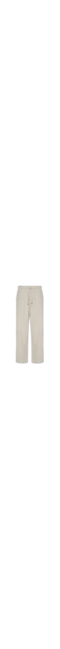 A calça bege é confeccionada em malha com baixa elasticidade. A peça solta ao corpo possui cintura média, cós com cordão embutido para ajuste, recorte posterior, bolso posterior, bolsos frontais modelo faca e comprimento longo.