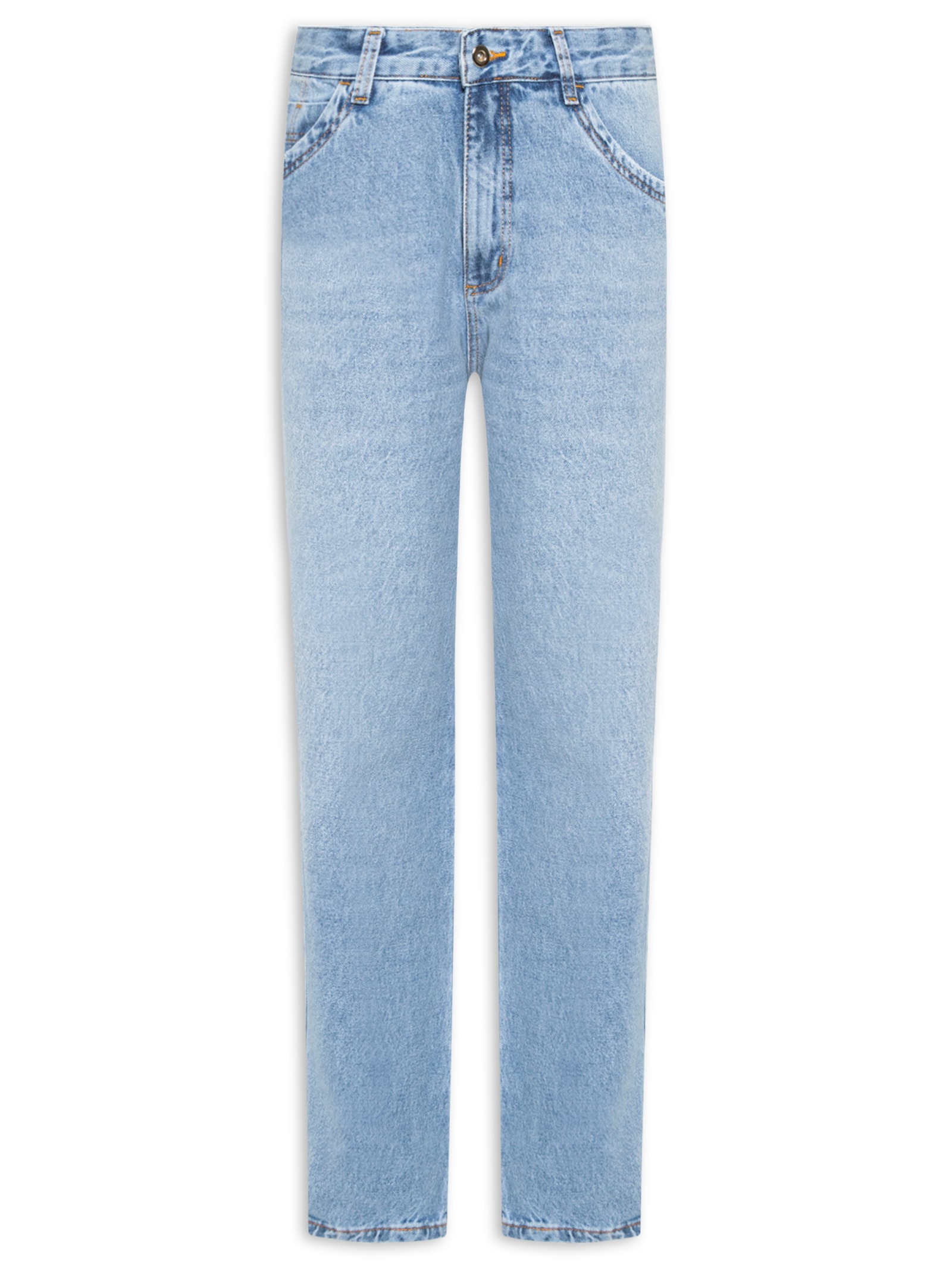 A calça azul é confeccionada em sarja com lavagem em jeans e sem elasticidade. A peça de modelo reta solta ao corpo possui cintura média, cós com passantes, recorte posterior, five pockets* com detalhe de puído, efeito estonado, comprimento longo e fechamento frontal por botão e zíper.