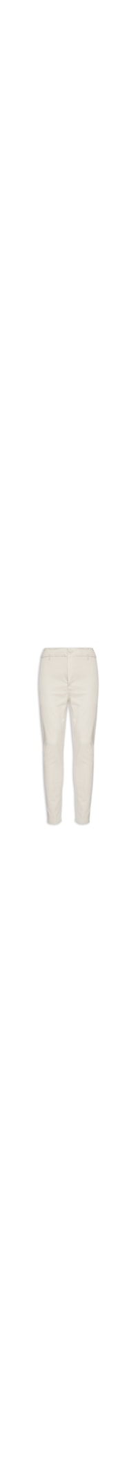 A calça bege é confeccionada em sarja com baixa elasticidade. A peça solta ao corpo, de modelo slim, possui cintura média, cós com passantes aplicados, bolsos frontais modelo faca, bolsos posteriores com fechamento por botão, pences posteriores, comprimento longo e fechamento por zíper e botão.
