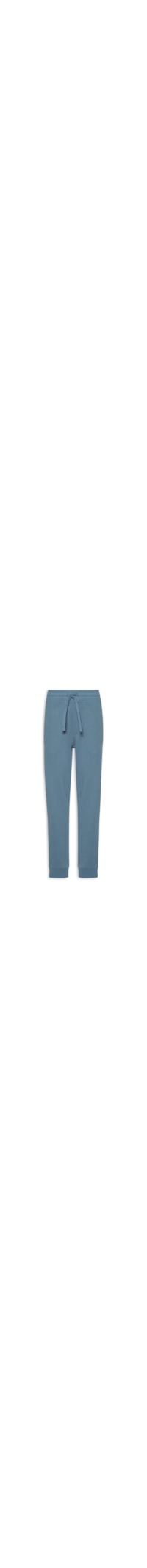 A Calça Masculina azul é confeccionada em malha de algodão sem elasticidade. A peça solta ao corpo possui cós com elástico embutido e cordão para ajuste, bolsos frontais embutidos, nome da marca aplicado na parte frontal, barra com acabamento em punho canelado e não possui fechamento.