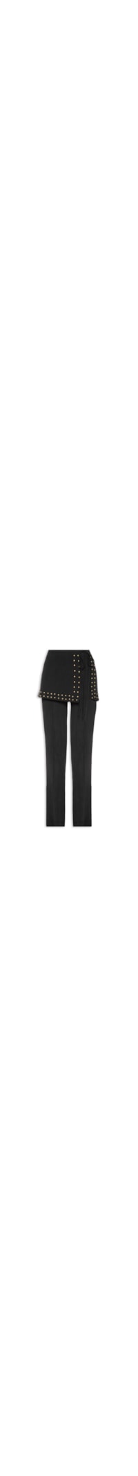 A calça preta é confeccionada em tecido leve sem elasticidade. A peça solta ao corpo possui cintura alta, detalhe de nervuras nas partes posterior e frontal, comprimento longo e fechamento lateral por zíper invisível. Acompanha pala no mesmo tecido e cor para uso opcional com detalhe de spikes e fechamento por amarração.