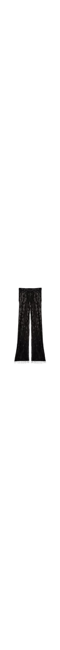 Calça pantalona confeccionada em tule, franjas e paetês brilhantes por toda parte. Shorts interno em tecido muito brilhante.