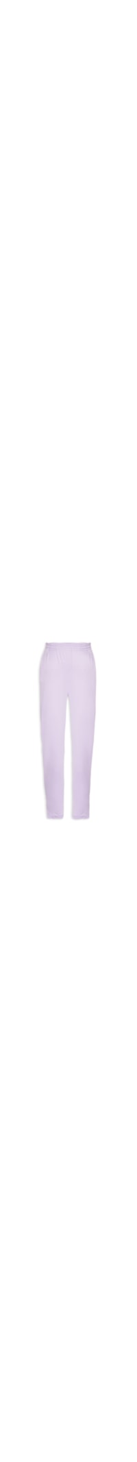 A calça lilás é confeccionada em malha com superfície texturizada. A peça possui cintura alta, cós elástico, bolsos frontais embutidos, fendas curtas laterais na altura das barras, comprimento longo, shape solto, caimento reto e acabamento pespontado.