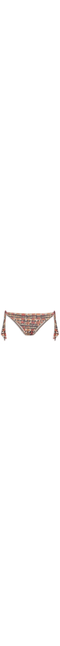 A calcinha laranja é confeccionada em malha de poliamida. A peça de modelo tanga possui laterais finas com tiras para amarração, estampa abstrata em cores contrastantes, forro e acabamento pespontado.