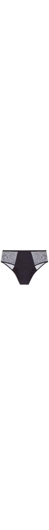 A calcinha preta é confeccionada em malha de poliamida. A peça de modelo hotpant possui cintura alta, laterais largas com recorte em tule, forro interno absorvente e acabamento elástico com viés aplicado.