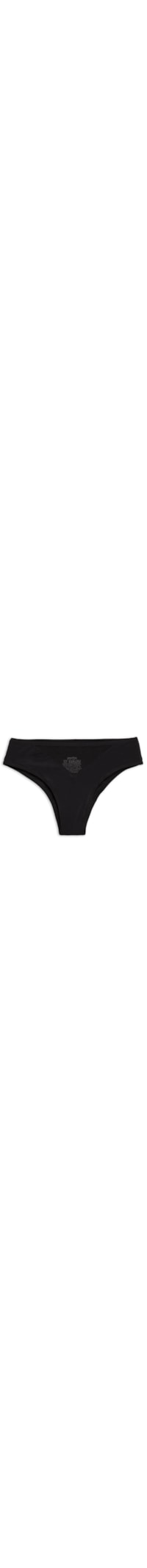 A calcinha preta é confeccionada em malha encorpada de poliamida. A peça de modelo tanga possui laterais médias, recorte frontal em tela, forro interno absorvente e acabamento elástico.