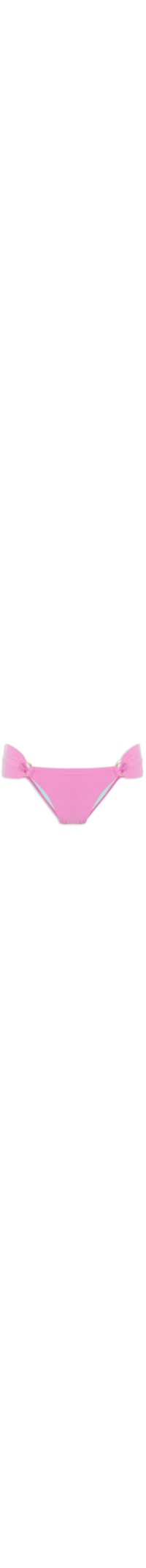 A calcinha rosa é confeccionada em malha leve com alta elasticidade. A peça de modelo tanga possui cintura baixa, laterais largas com efeito franzido e aros de metal embutidos na parte frontal.