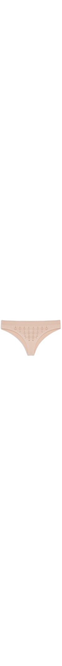 A calcinha bege é confeccionada em malha com alta elasticidade. A peça de modelo tanga possui detalhe de perfuros na parte frontal e forro.
