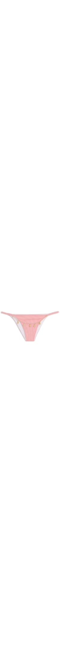 A calcinha vermelha é confeccionada em malha leve com alta elasticidade. A peça possui cintura baixa, laterais finas com efeito franzido, padronagem listrada em cor contrastante, e tag metalizada da marca aplicada na parte posterior. Acompanha corrente em metal dourada com pingentes aplicados para uso opcional.
