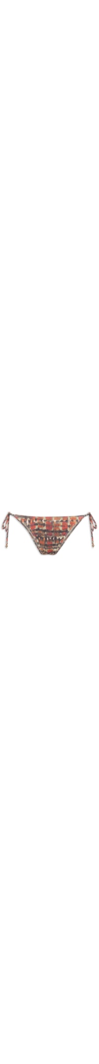 A calcinha laranja é confeccionada em malha de poliamida. A peça de modelo tanga possui laterais finas com tiras para amarração, estampa abstrata em cores contrastantes, forro e acabamento pespontado.