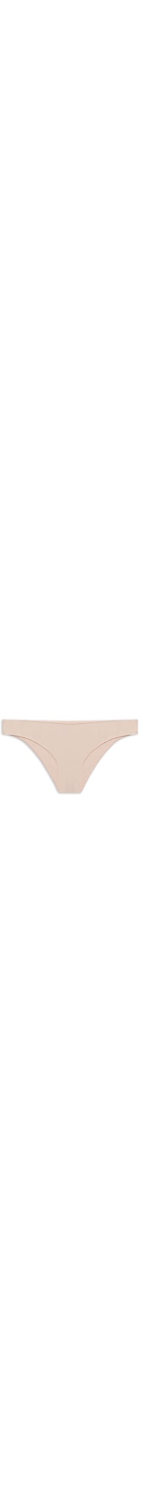 A calcinha bege é confeccionada em malha de microfibra de média elasticidade. A peça de modelo biquíni, possui cintura baixa, laterais médias, acabamento overlocado e forro.