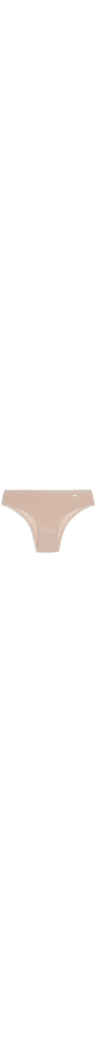 A calcinha biquíni bege é confeccionada em malha de algodão. A peça de modelo biquíni possui laterais média, cós aplicado, shape justo, logo da marca aplicado na parte frontal esquerda e acabamento elástico.