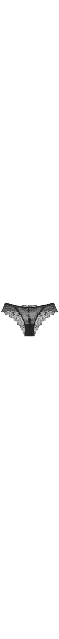 A calcinha preta é confeccionada em renda. A peça de modelo biquíni possui tiras largas laterais, recortes, tag da marca aplicada na parte frontal e acabamento em elástico.