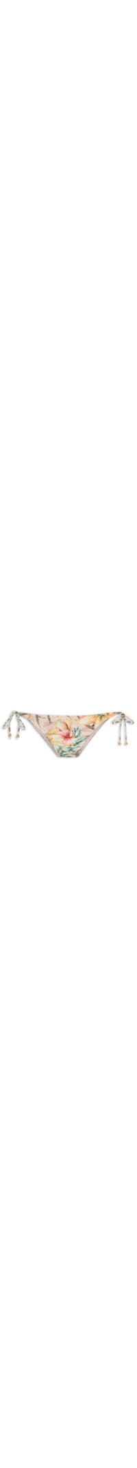 A calcinha bege é confeccionada em malha de poliamida. A peça de modelo tanga possui laterais finas com tiras de amarração, mix de estampas em cores contrastantes, forro e acabamento pespontado.