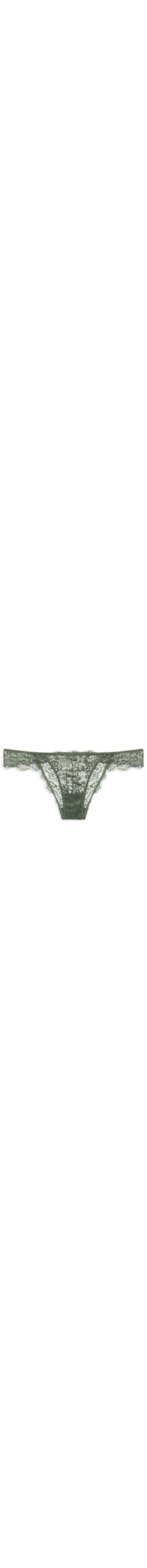 A calcinha verde é confeccionada em renda com média elasticidade. A peça de modelo biquíni possui laterais médias, transparência e forro em algodão.