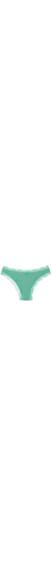 A calcinha verde é confeccionada em malha de leve com alta elasticidade. A peça de modelo tanga possui laterais médias, cintura baixa, cavas e cós com aplicação de renda, detalhe de laço aplicado na parte frontal, forro de algodão e acabamento elástico.