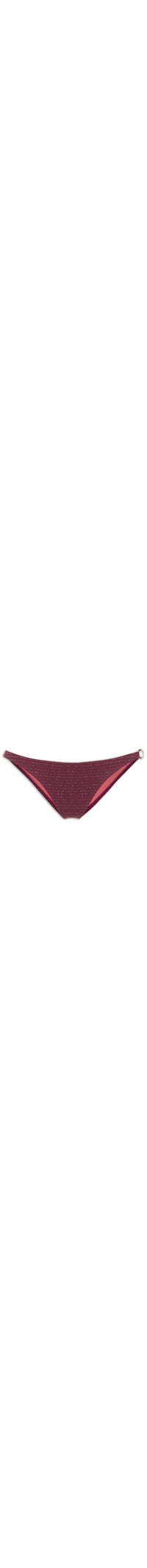 A calcinha vinho é confeccionada em malha de poliamida com superfície em fios de lurex. A peça de modelo tanga possui laterais finas, aplicação de aviamento metálico na lateral, forro em cor contrastante e acabamento pespontado.