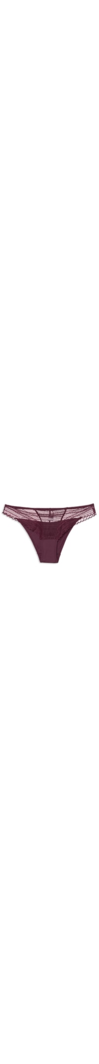 A calcinha vermelha é confeccionada em malha de poliamida com alta elasticidade. A peça de modelo biquíni possui laterais médias, recortes com aplicação de renda na parte frontal e posterior, forro e tag da marca metalizada aplicada na parte posterior.