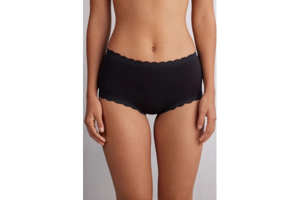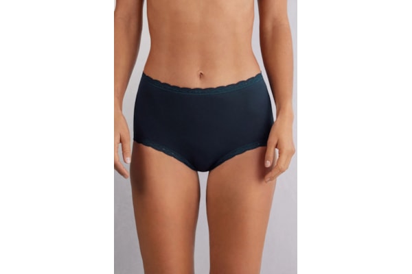 Calcinha culotte de cintura alta em algodão macio e elástico, rematada com um romântico folho de renda. É o modelo ideal para quem procura uma peça envolvente e com cobertura.