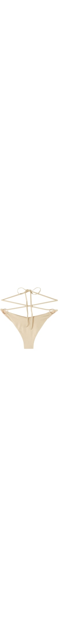 Calcinha de biquíni brasileira com cintura em V à frente e atrás e cava alta estilo anos 80, caracterizada por tiras compridas dos lados que podem ser cruzadas e apertadas com laço na parte da frente. Pormenor moda de argolas isentas de níquel. Tecido em microfibra brilhante shine. Completamente forrada e com costuras invisíveis, pensadas para não marcar.