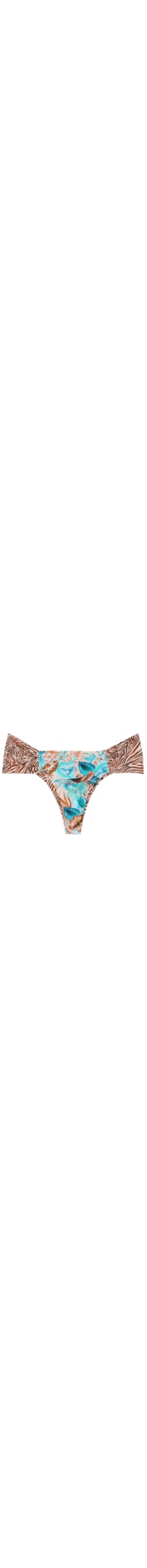 Calcinha de biquíni brasileira reversível com drapeado nas laterais para ajustar a altura. Apresenta um padrão de folhagem combinado com estampa de zebra para uso duplo. Costuras invisíveis.