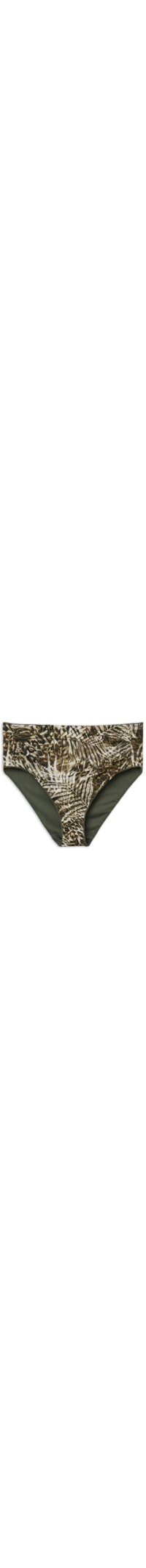 Calcinha de biquíni de cintura alta com efeito modelador na região do abdômen, graças ao forro frontal em tule especial. A estampa combina folhagens tropicais com elementos que remetem às listras do animal print, criando um visual exótico e sofisticado. Totalmente forrada e com acabamento de costuras invisíveis para máximo conforto.