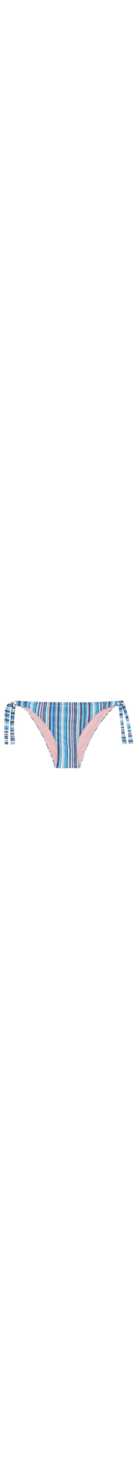 Calcinha de biquíni com laços permitindo ajustar a peça. Caracteriza-se pelo tecido com estampa de listras coloridas e decorado com lamê.