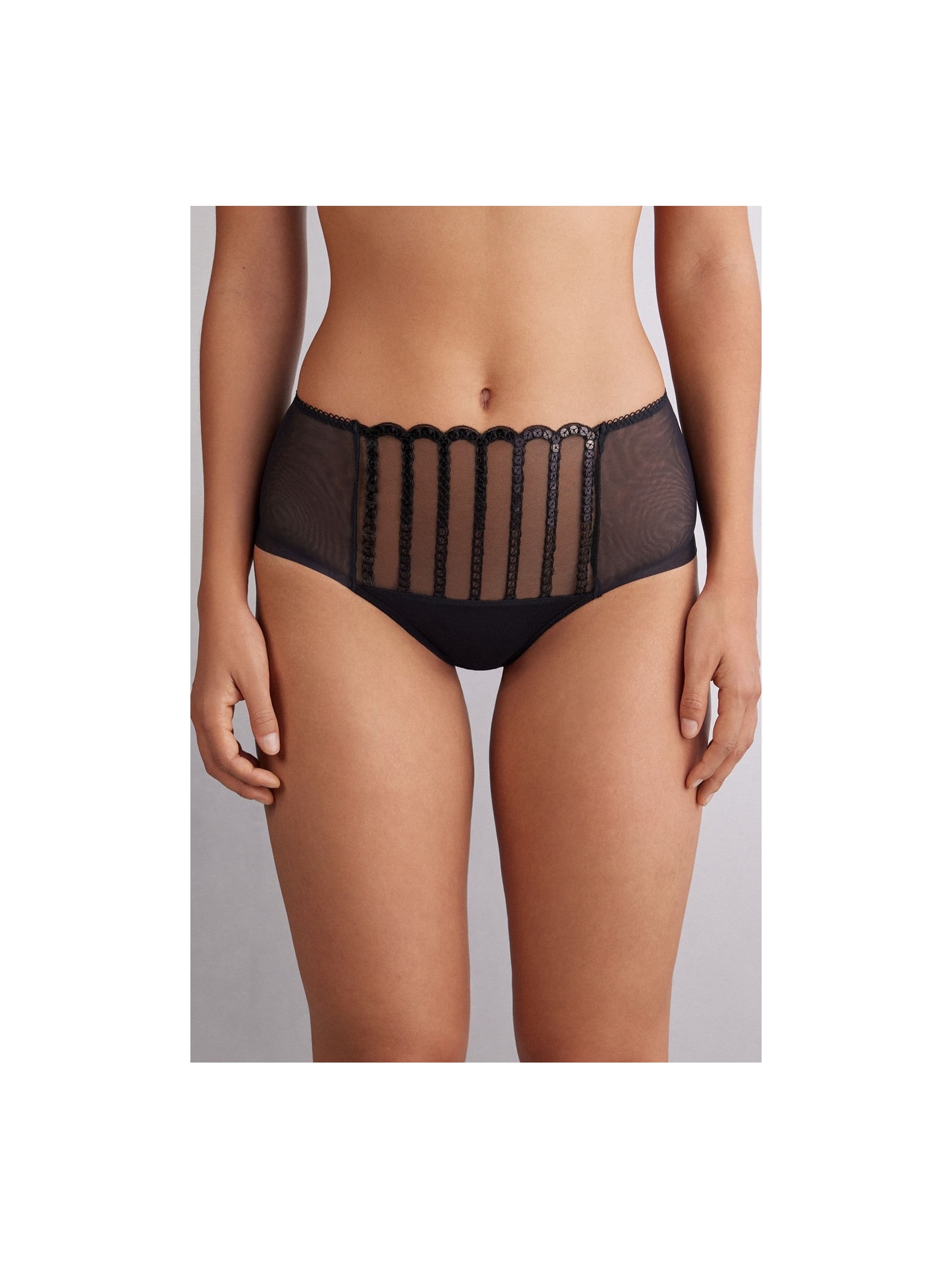 Calcinha estilo culotte em tule macio e elástico, com bordado de paetês em padrão geométrico na parte frontal. Acabamentos elegantes em cetim. A parte traseira e as laterais são em tule duplo, sem elástico nem costuras, garantindo máximo conforto.