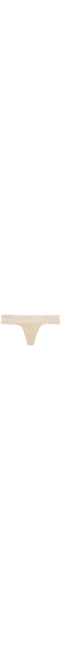 A calcinha bege é confeccionada em malha leve de alta elasticidade. A peça de modelo fio dental, possui cintura baixa, cós em renda com leve transparência, laterais médias, tag da marca aplicada na parte posterior, recorte posterior e forro.