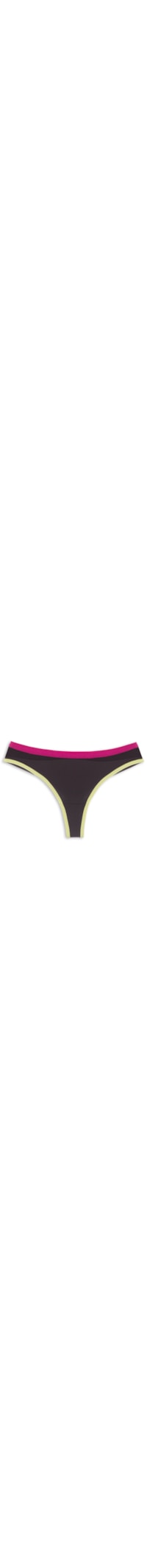 A calcinha preta é confeccionada em microfibra e tule. A peça de modelo fio dental possui laterais médias, cós elástico na cor rosa com tag da marca aplicada na parte posterior, recorte frontal em tule com transparência e acabamento em viés na cor amarela.