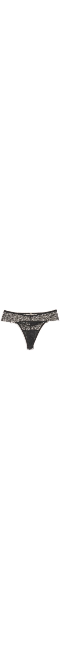 A calcinha preta é confeccionada em renda. A peça de modelo fio dental possui laterais médias, logo da marca aplicado em metal na parte frontal, forro e transparência.