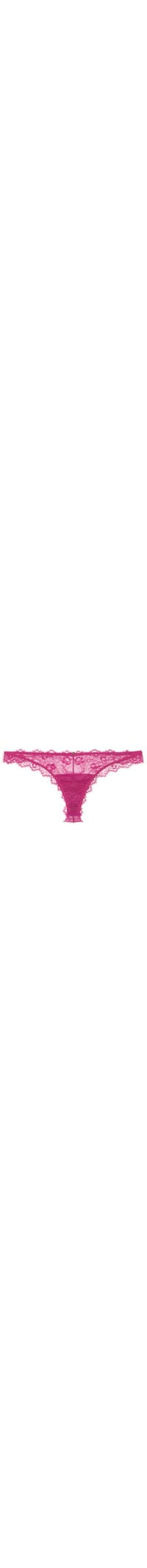 A calcinha rosa é confeccionada em renda com média elasticidade. A peça de modelo fio dental possui cintura baixa, laterais médias, transparência, forro e tag da marca aplicada na parte posterior.